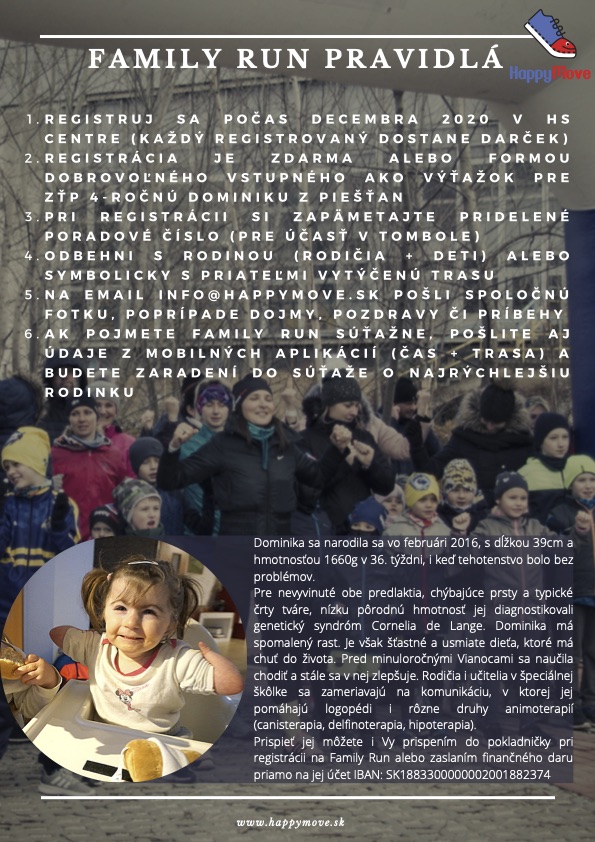 Prispieť jej môžete i Vy prispením do pokladničky pri registrácii na Family Run alebo zaslaním finančného daru priamo na jej účet IBAN: SK1883300000002001882374